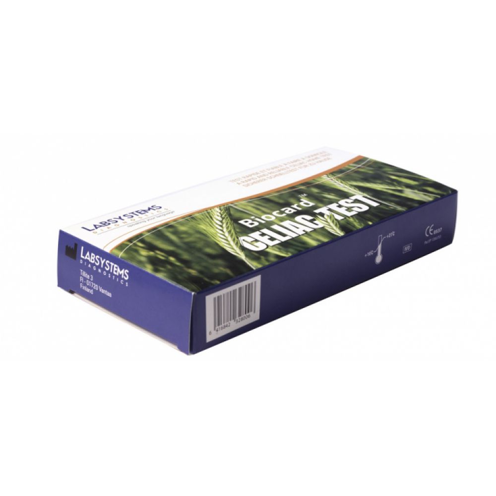 Il test per celiachia Biocard™ è un test immunocromatografico a flusso laterale rapido per il rilevamento qualitativo degli anticorpi IgA anti-transglutaminasi tissutale da un campione di sangue del polpastrello. Il test contiene anche un sistema di controllo integrato